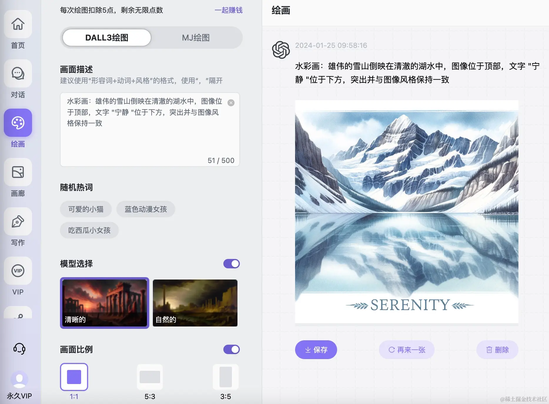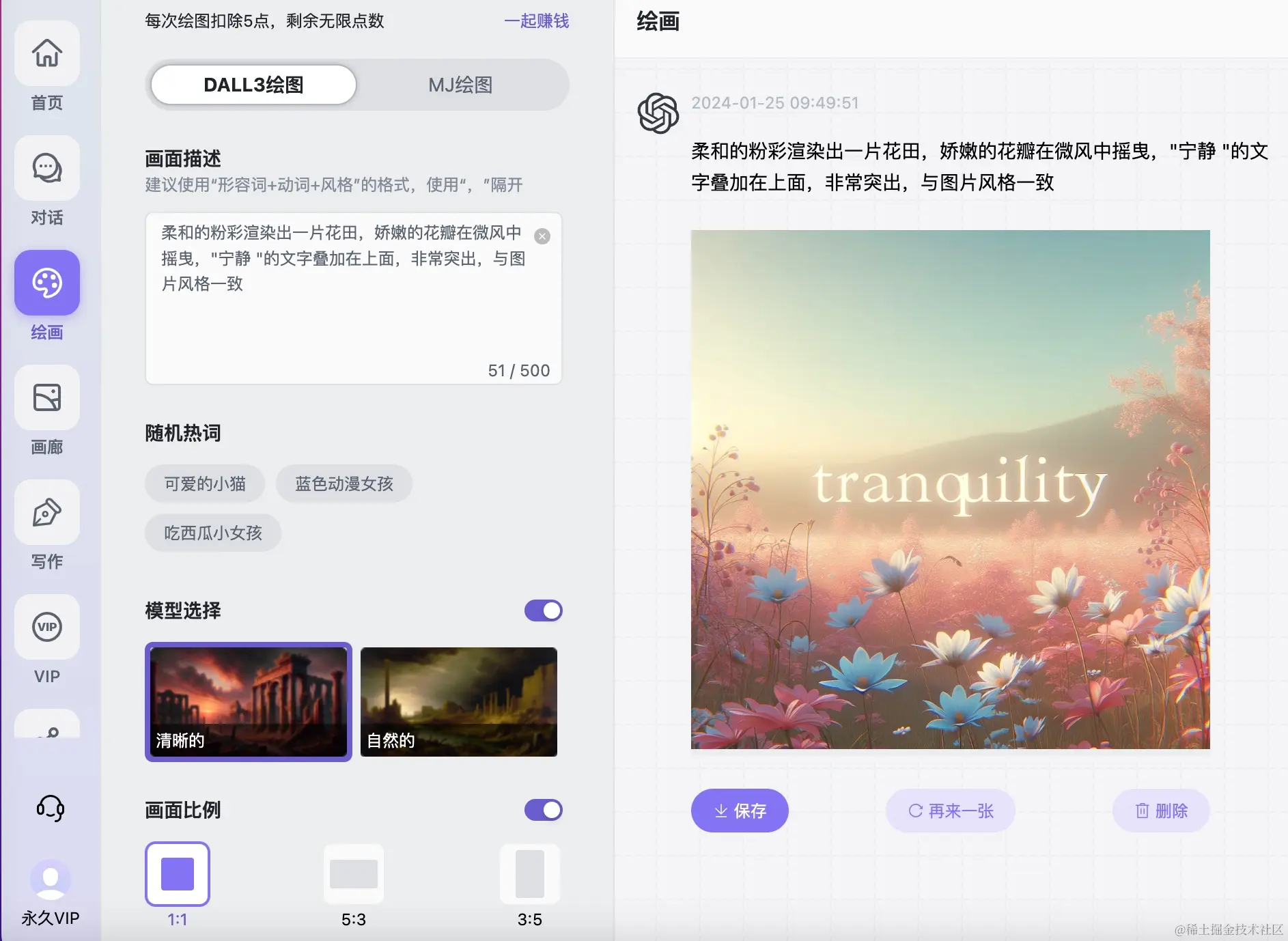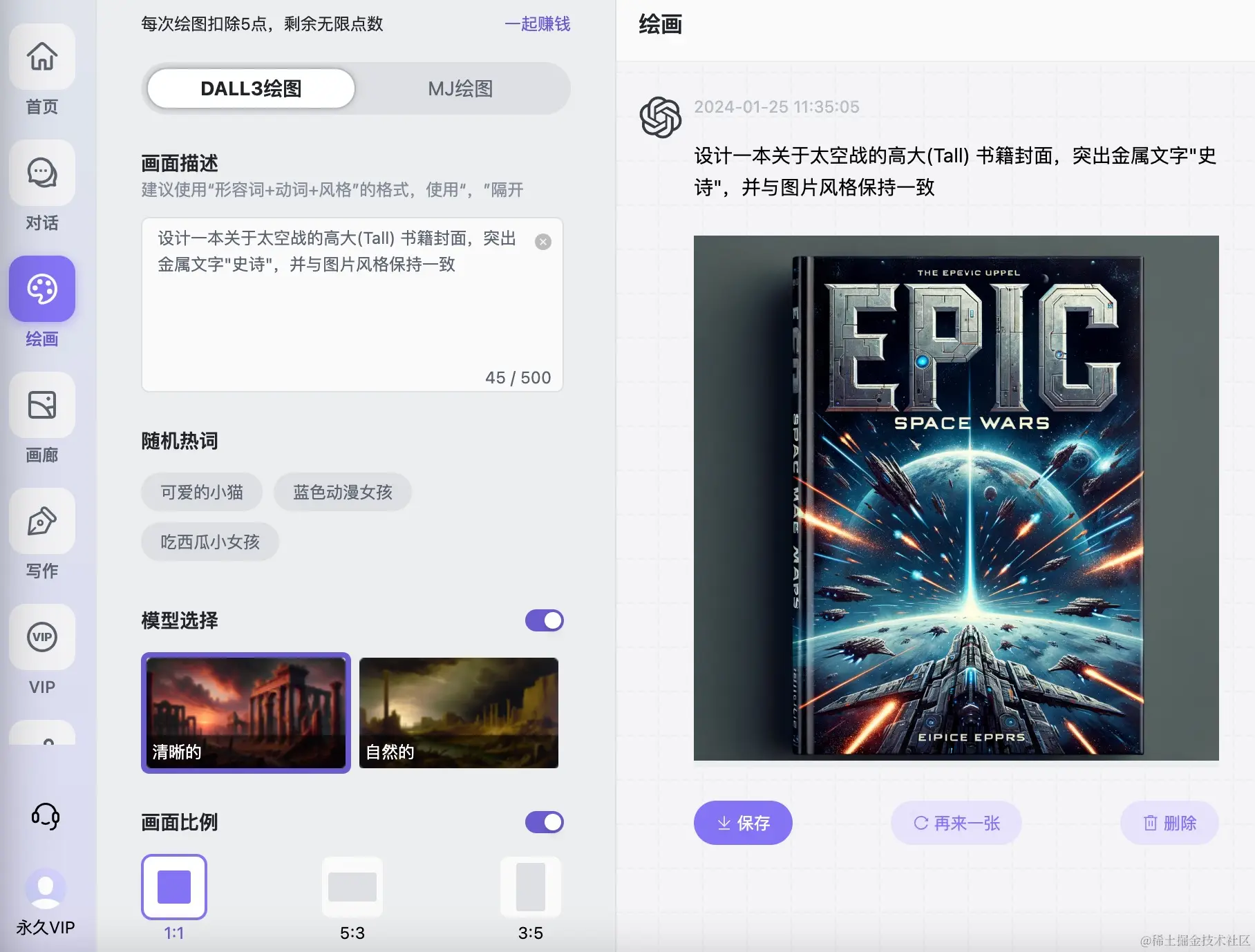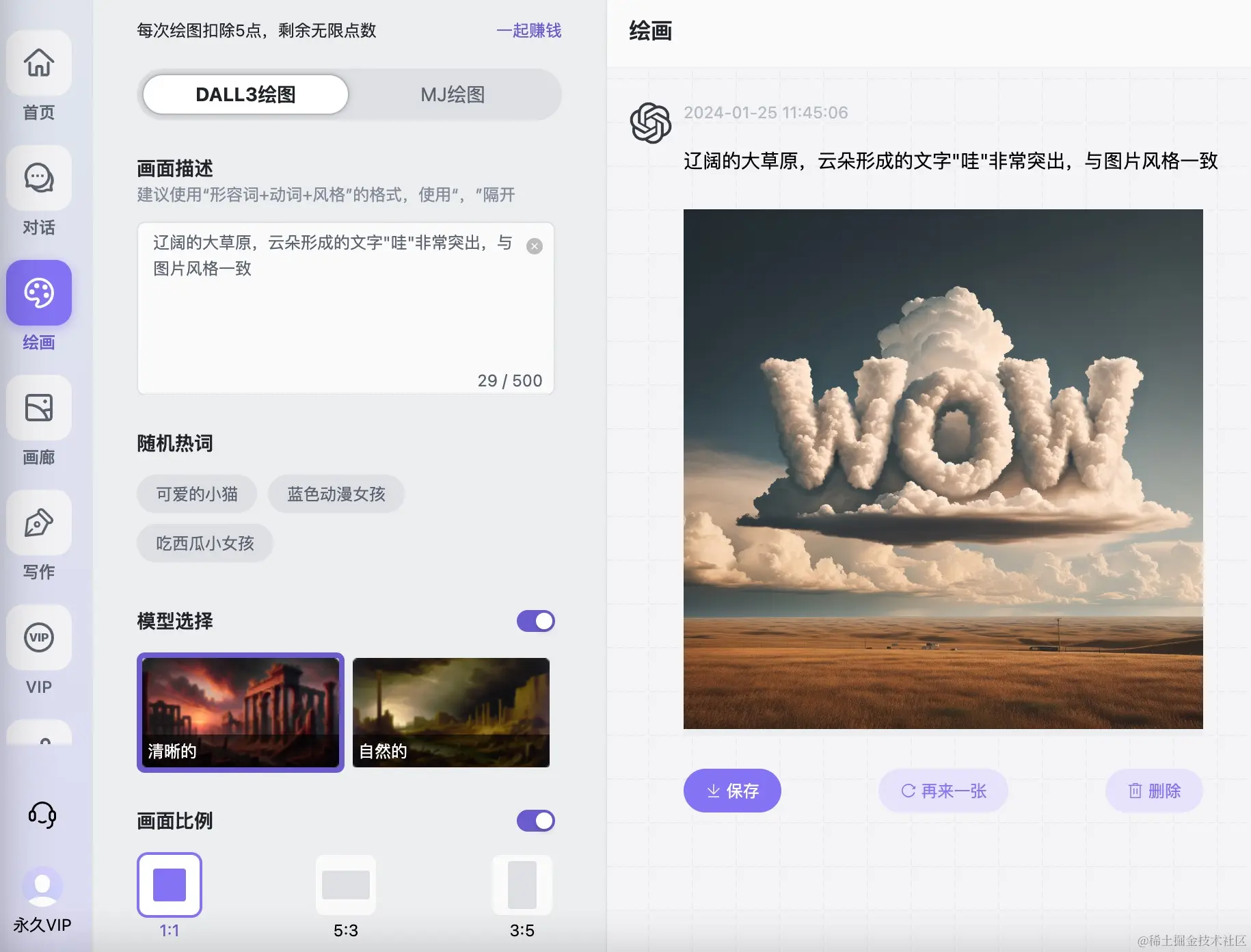 打开【绘画】工具,使用该英文提示词生成图片,如果有不满意的地方,可以重新调整