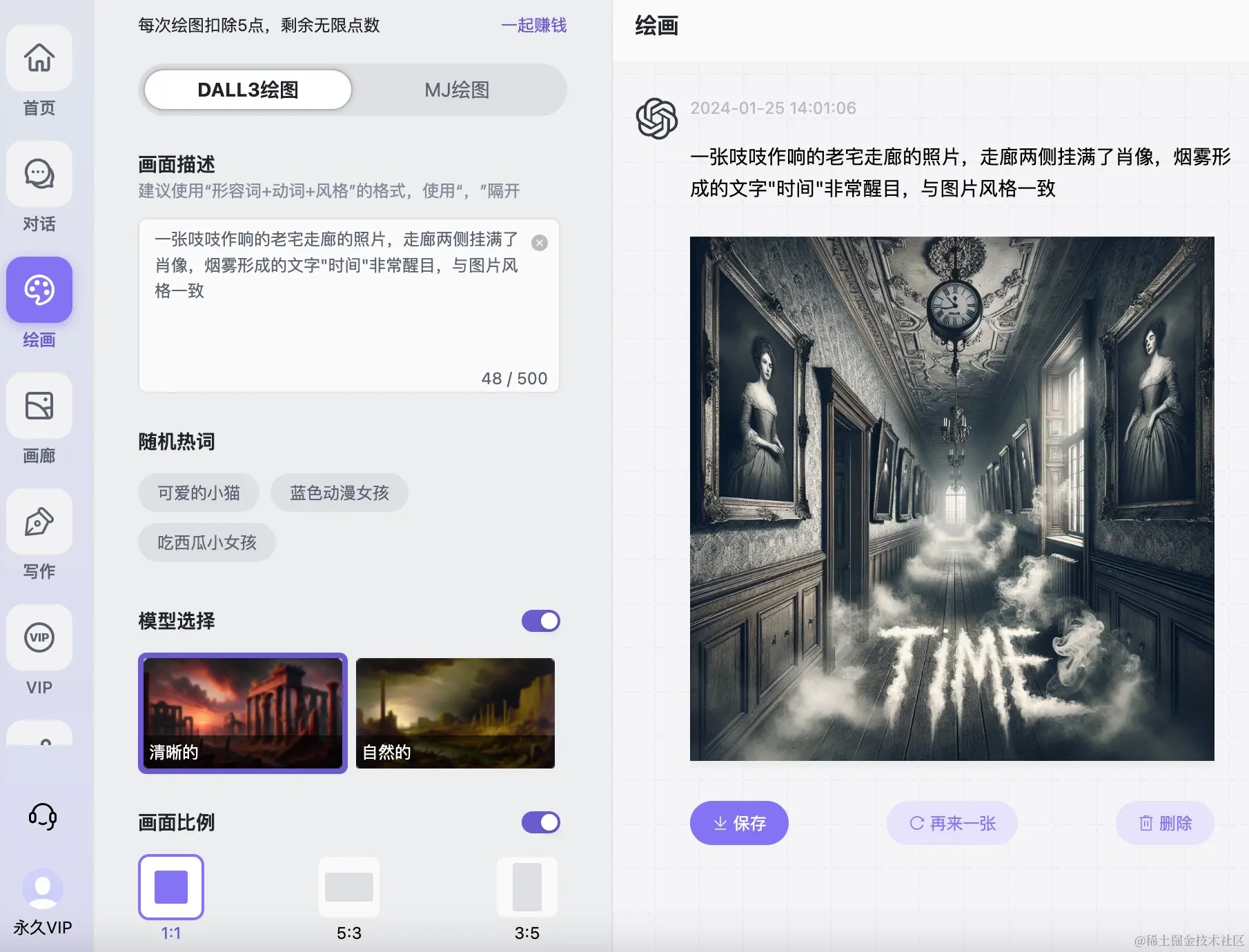 - 烟雾:[图片提示词],烟雾形成的文字"[文字]"非常醒目,并与图像风格保持一致。 eg:一张吱吱作响的老宅走廊的照片,走廊两侧挂满了肖像,烟雾形成的文字"时间"非常醒目,与图片风格一致。