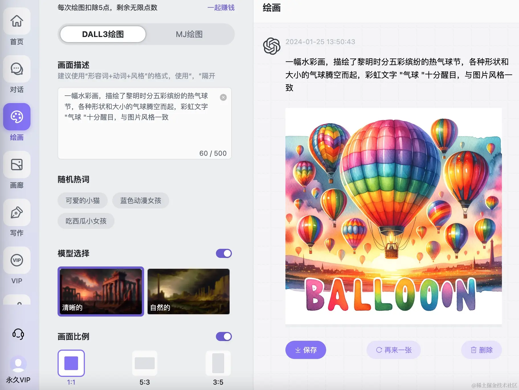 - 彩虹字:[图像提示词],彩虹文字"[文字]"非常醒目,并与图像样式保持一致。 eg:一幅水彩画,描绘了黎明时分五彩缤纷的热气球节,各种形状和大小的气球腾空而起,彩虹文字 "气球 "十分醒目,与图片风格一致。
