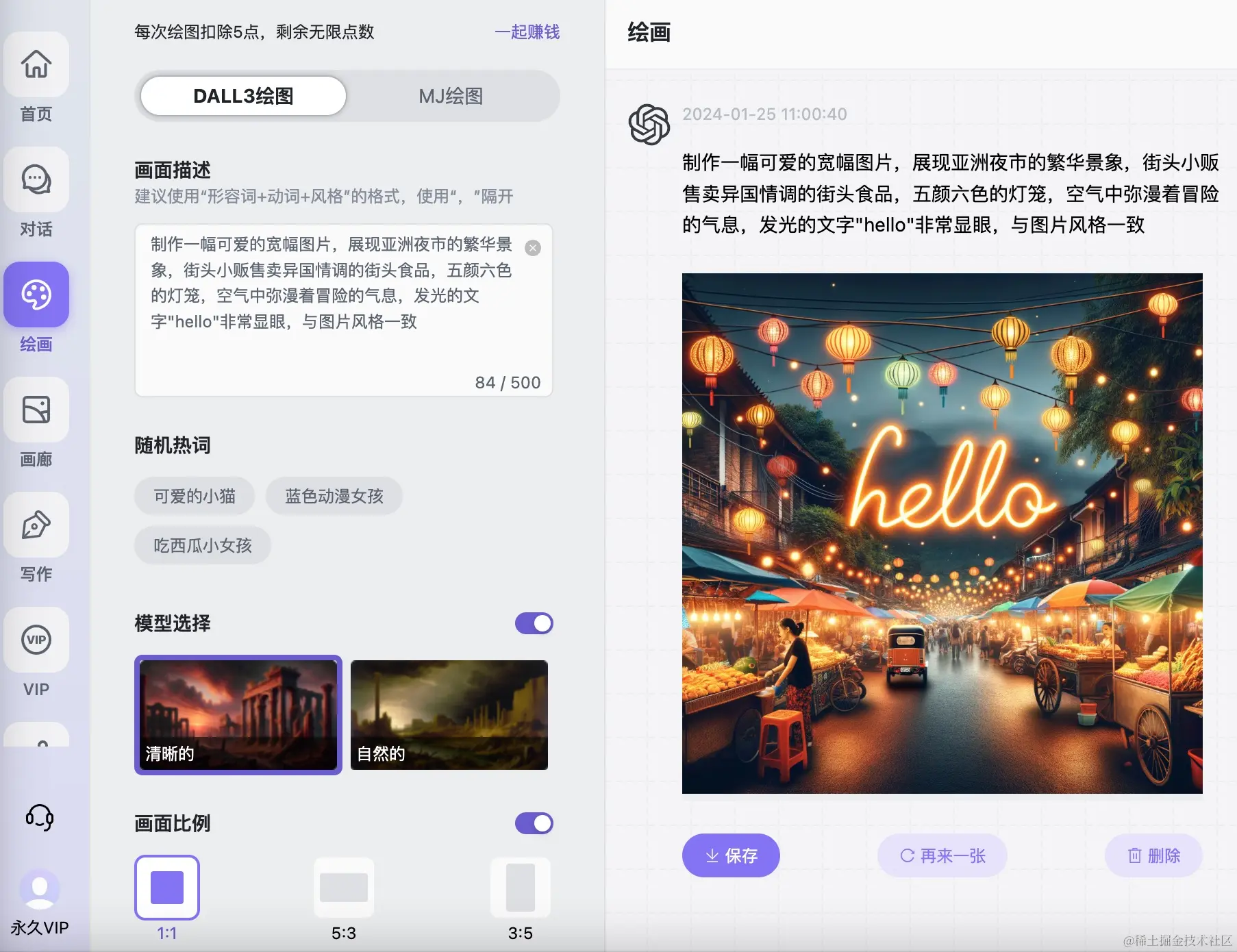 - 发光文字:[图像提示词],发光文字"[文字]"非常醒目,并与图像样式保持一致。 eg:制作一幅可爱的宽幅图片,展现亚洲夜市的繁华景象,街头小贩售卖异国情调的街头食品,五颜六色的灯笼,空气中弥漫着冒险的气息,发光的文字"hello"非常显眼,与图片风格一致。