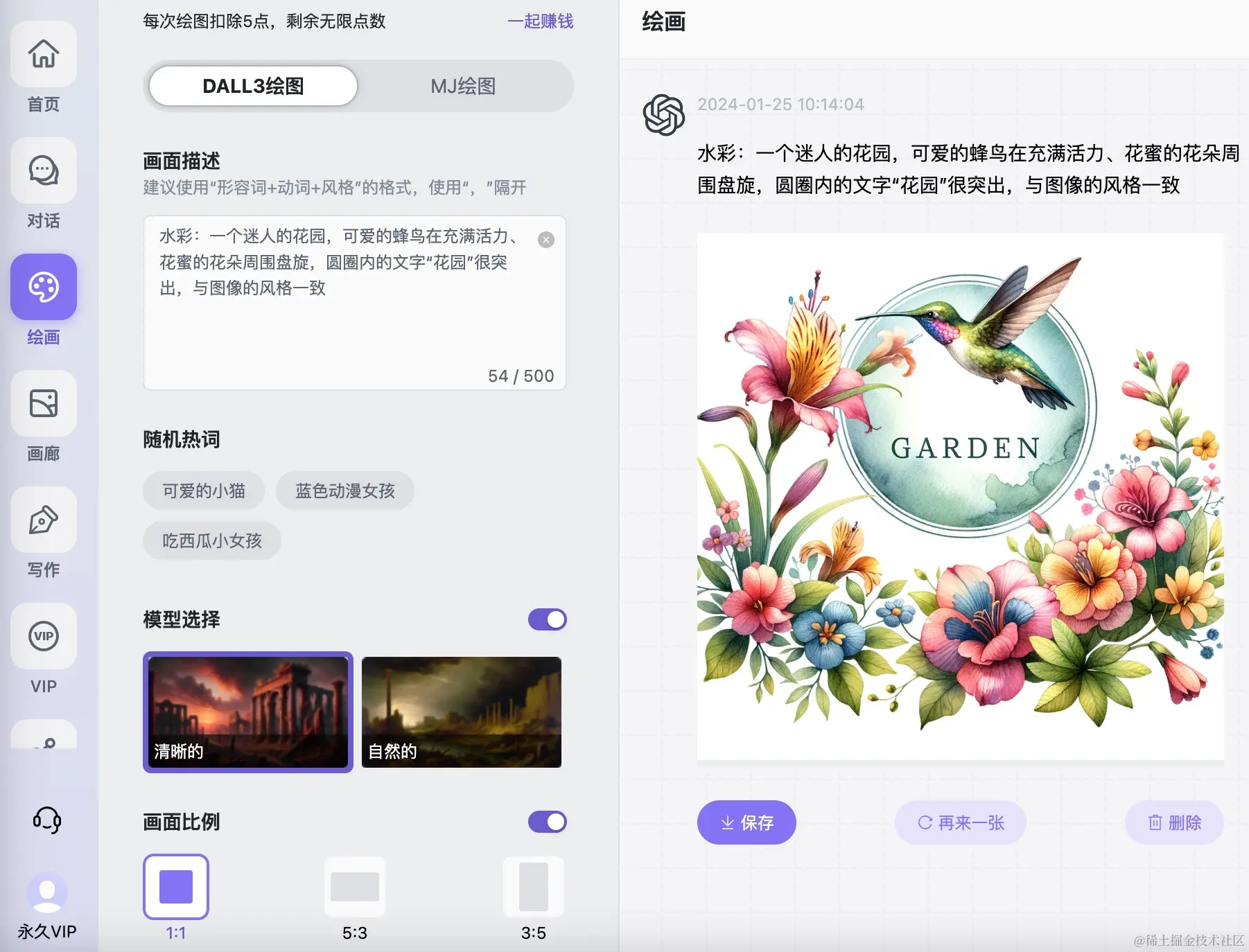 - 圆形:[图像提示词],圆圈内的文字"[文字]"非常醒目,并与图像样式保持一致。 eg:水彩:一个迷人的花园,可爱的蜂鸟在充满活力、花蜜的花朵周围盘旋,圆圈内的文字“花园”很突出,与图像的风格一致。