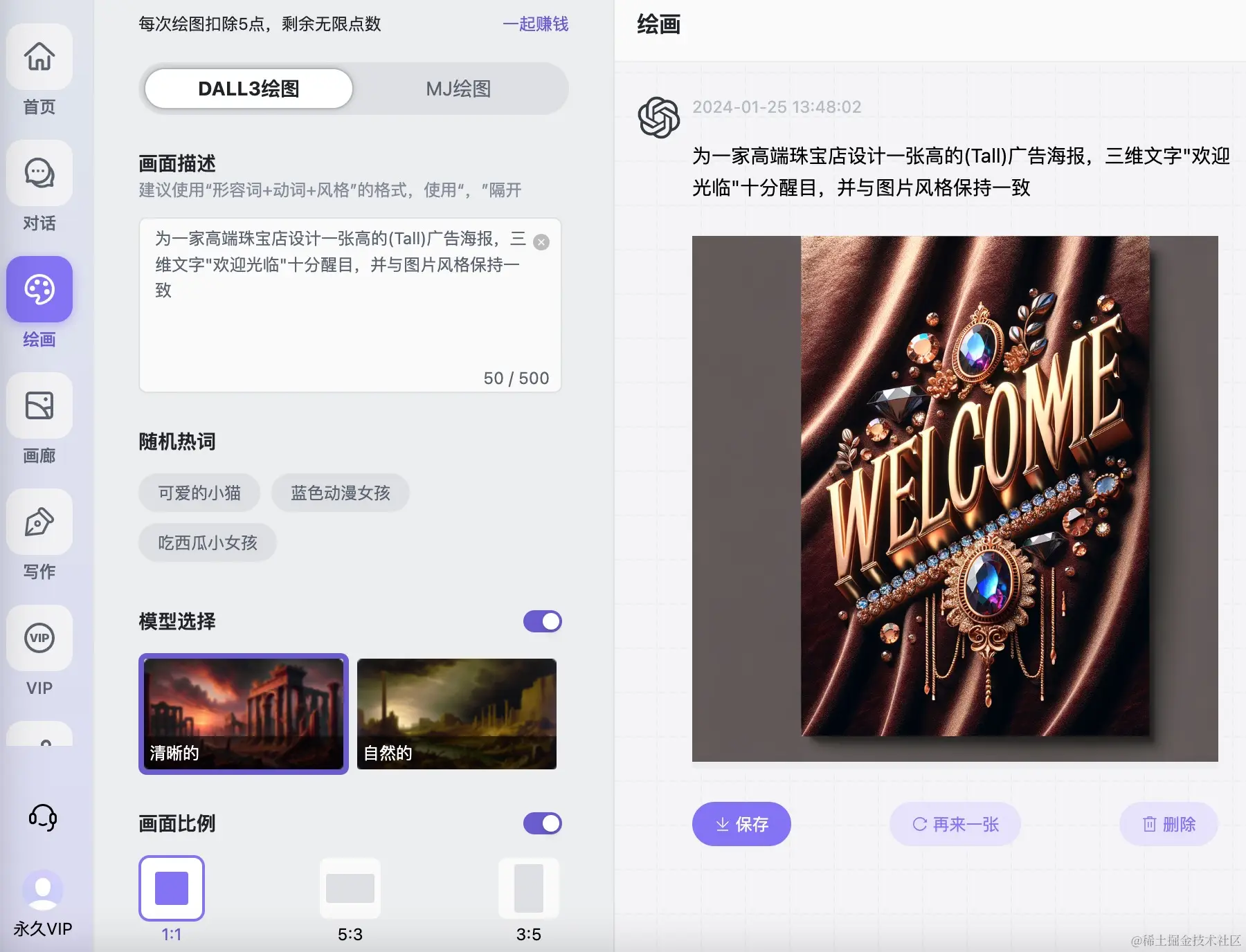 - 3D 文字:[图像提示词],三维文字"[文字]"非常醒目,并与图像样式保持一致。 eg:为一家高端珠宝店设计一张高的(Tall)广告海报,三维文字"欢迎光临"十分醒目,并与图片风格保持一致。
