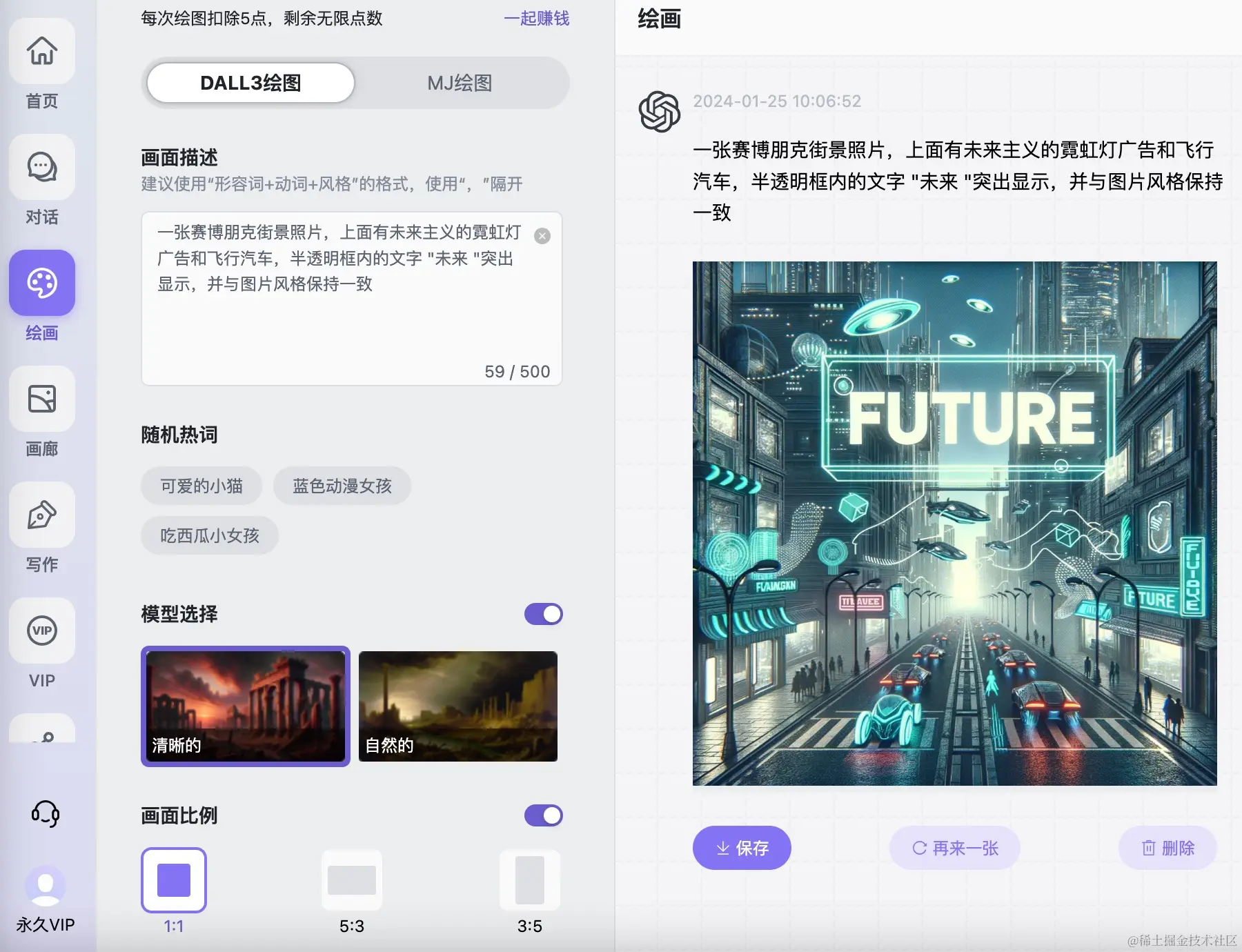 - 透明盒子:[图像提示词],半透明框内的文字"[文字]"非常醒目,并与图像样式保持一致。 eg:一张赛博朋克街景照片,上面有未来主义的霓虹灯广告和飞行汽车,半透明框内的文字 "未来 "突出显示,并与图片风格保持一致。