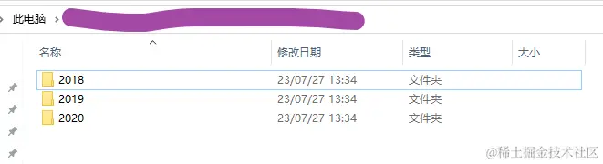 首先,我们来明确一下本文的需求。现在有一个大文件夹,其中具有多个表示年份的子文件夹,每一个子文件夹对应一个年份;如下图所示。