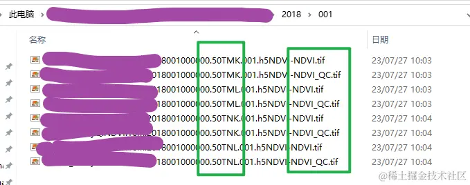 随后,每一个表示天数的子文件夹中,就是我们希望加以提取、复制的文件了(在本中,就是一些.tif格式的遥感影像文件;如果大家需要复制其他格式的文件,思路和本文也都是一致的);我们以2018文件夹中的001子文件夹为例,将其打开后如下图所示。但是,这些文件自身还有一定特征——首先,如下图左侧绿色框内的部分所示,这些遥感影像文件来自不同的分幅,而这一部分的文字就是表示了他的分幅;我们希望,将同一个分幅的所有遥感影像文件在后期复制到同一个文件夹内(比如所有名称带有50TMK字样的遥感影像文件,都放在名称为50TMK的目标文件夹中);其次,那些以_QC.tif字段结尾的遥感影像我们都不需要,无需复制,只复制不带_QC字段的遥感影像文件即可。
