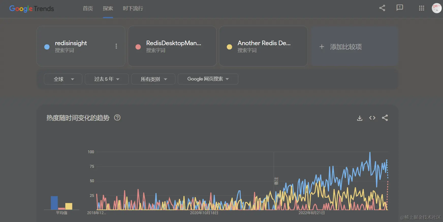 可以看到蓝色的线就是Redis官方的RedisInsight,可以看到基本上它的趋势就和它的免费、付费紧密关联着。