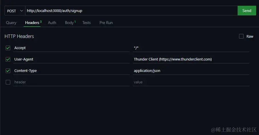 向http://localhost:3000/auth/signup发送一个POST请求,其中包含Headers Content-Type : application/json和以下JSON主体: