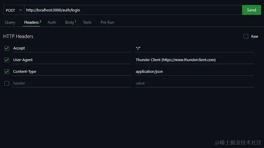 向http://localhost:3000/auth/login发送一个POST请求,其中包含Header Content-Type : application/json和JSON主体以及用户名和密码,这是您在注册路由中创建的。