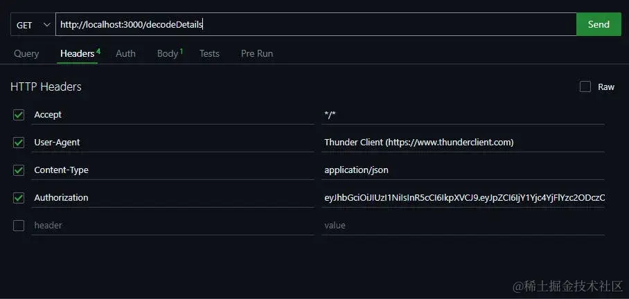 向http://localhost:3000/decodeDetails发送一个GET请求,并带有一个带有令牌值的Authorization头(您在测试登录路由时得到了它)。