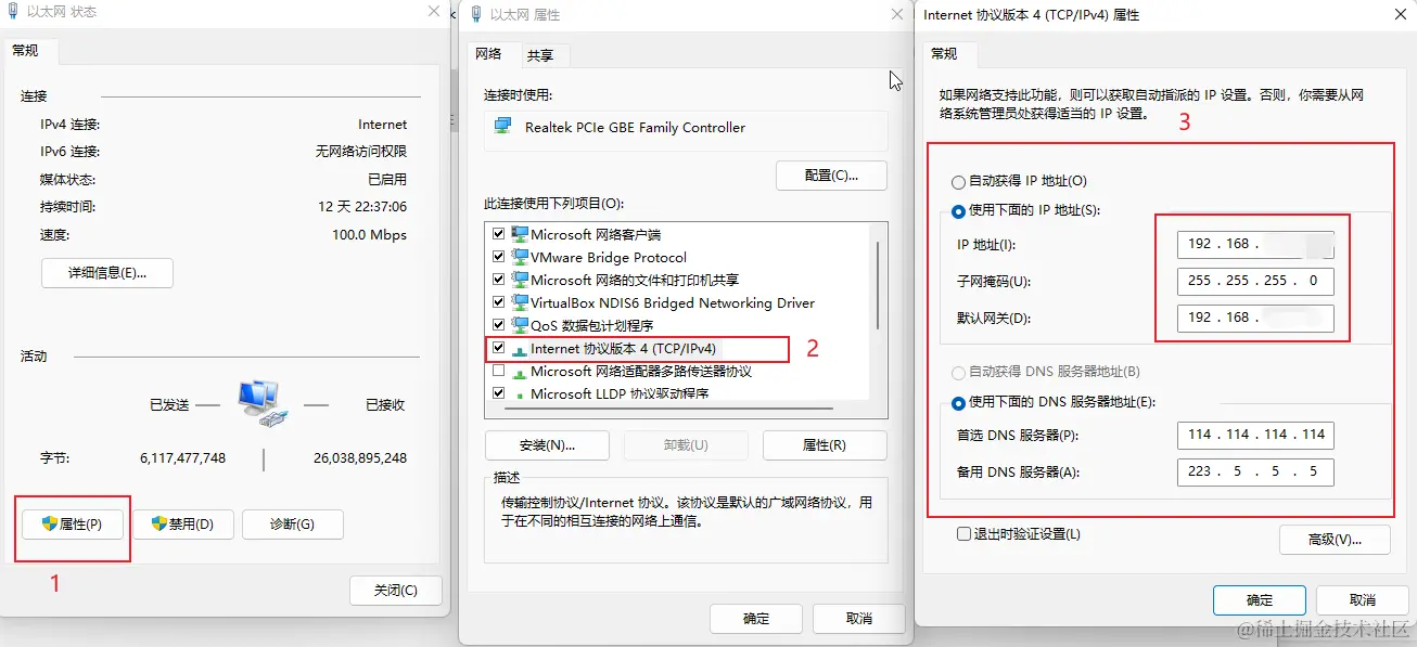 紧接着打开”控制面板\网络和 Internet\网络连接“双击使用中的以太网,将本机的IP地址写入到协议里。