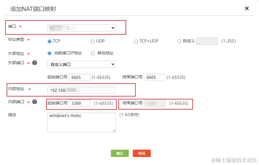内部端口:也就是我们需要映射的远程桌面的端口:3389