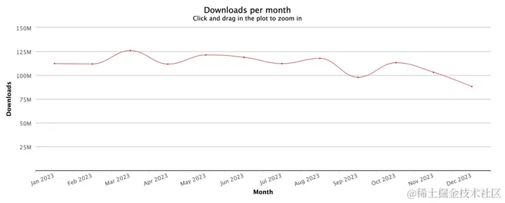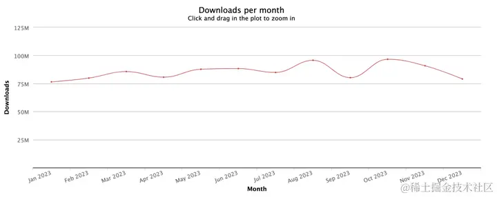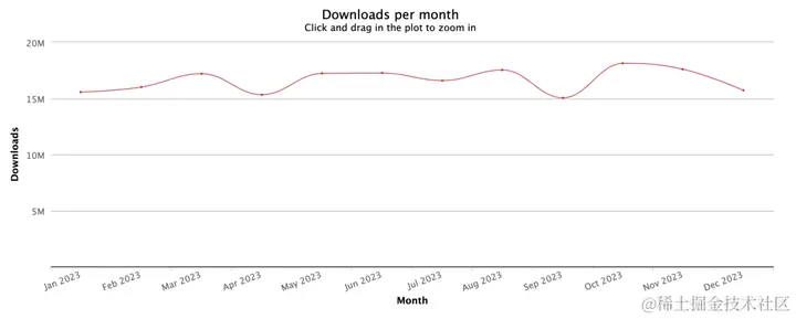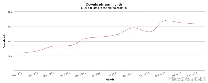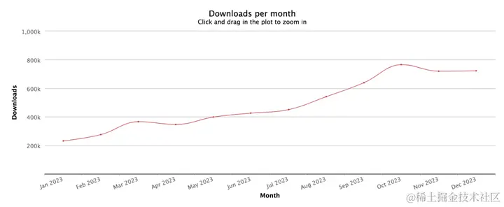 Vite 每月平均下载量 2200w 左右,2023 年累计下载量:281,709,946(2.8 亿)。