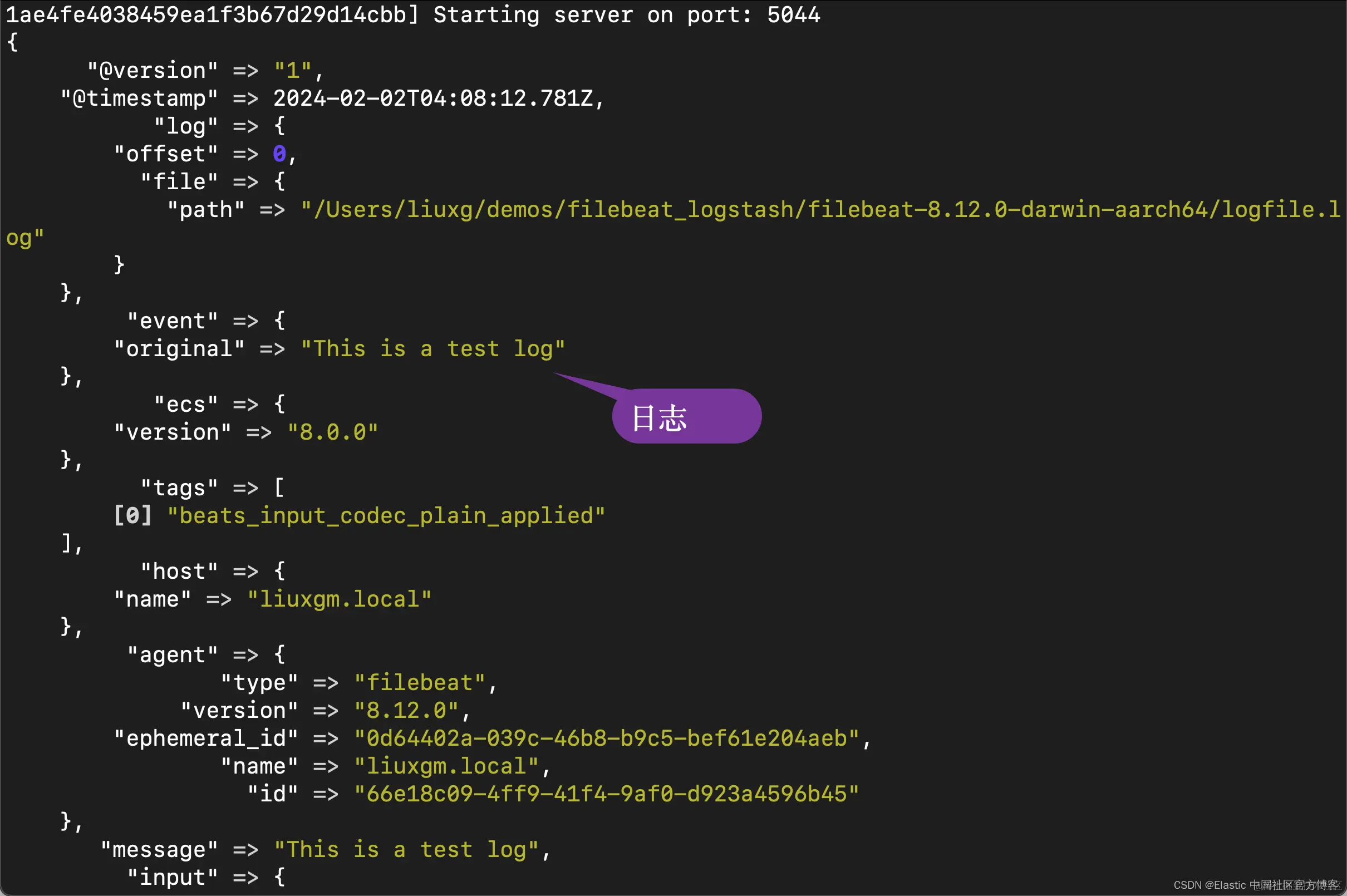 从上面的输出中,我们可以看到日志被正确地采集到 Logstash。我们可以更进一步输出到 Elasticsearch。在这里,我们就不再累述了。