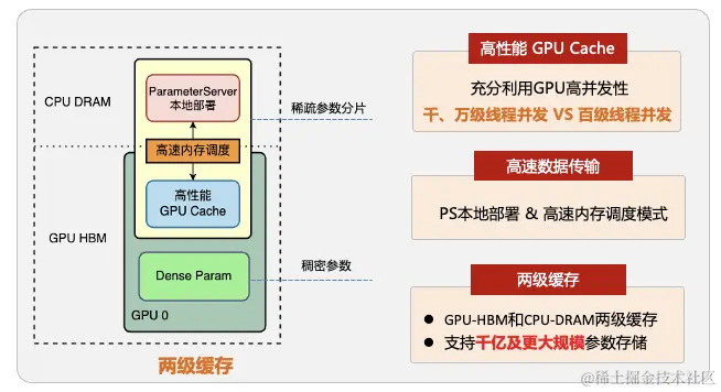 基于GPU-HBM和CPU-DRAM的两级交叉参数服务器,**实现稀疏参数的跨域存储。GPU作为一级缓存有效利用GPU高带宽、高算力的优势,极大提升训练吞吐,CPU作为二级缓存有效利用CPU内存的高容量、易扩展的优势,提升参数的规模上限。该方案可以进一步扩展SSD固态硬盘,形成HBM-DRAM-SSD的三级参数服务器方案,支撑更大规模万亿参数级别的高性能训练。
