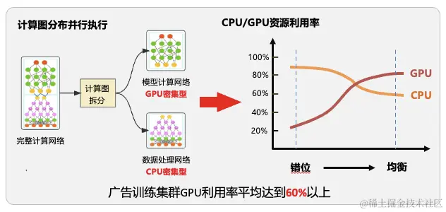 CPU&GPU异构的分布式流水线并行训练框架,将模型按CPU密集型子图(重逻辑)与GPU密集型子图(重计算)进行分图,部署于CPU&GPU异构集群进行分布式分图训练,在发挥各自硬件算力优势的同时,解决CPU与GPU算力不匹配的问题,达到算力均衡。同时构建多级流水线并行训练模式,使训练集群整体IO、计算吞吐最大化。