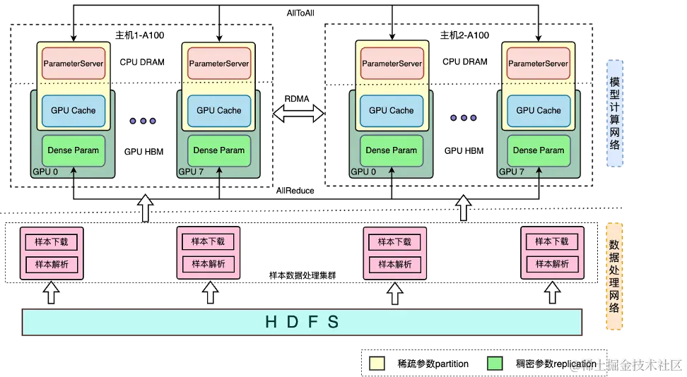 结合对业界方案的调研以及广告推荐算法的业务场景特点,我们设计了基于高性能算力的全GPU训练方案:基于GPU-HBM+CPU-DRAM两级交叉缓存来实现全参数的GPU存储计算,结合GPU-RDMA集合通信技术突破大规模参数训练的通信瓶颈,同时构建CPU&GPU异构的分布式流水线并行训练框架,实现了CPU和GPU计算算力的最大化协同。