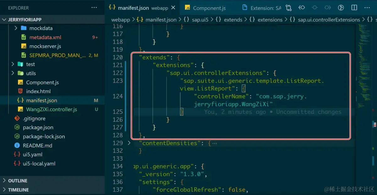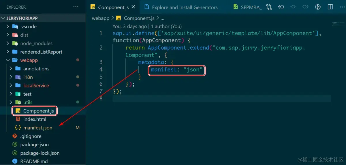 我们首先仔细查看 Fiori Elements 生成的项目文件里,发现只有一个光秃秃的 Component.js, 里面声明了一个 json 格式的元数据描述文件 manifest.json. 而我们知道 json 格式的文件,里面是无法编写应用逻辑的。