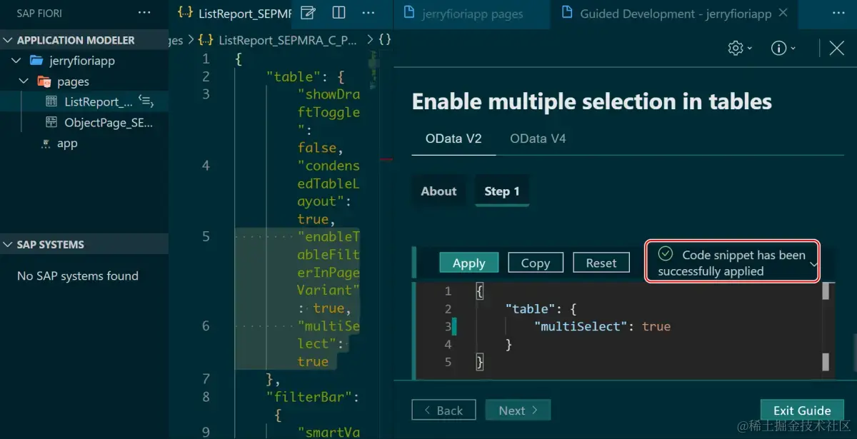 下图的含义是,只需在 manifest.json 文件里给 table 字段添加上 multiSelect 为 true 的属性,即可让 Fiori Elements List Report 应用的表格,支持多选。点击 Apply,即可自动完成对 manifest.json 的修改,结束 Adaptation.