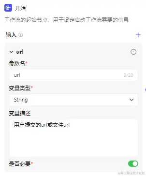 开始这里设置一个参数url,就用户提交的url或文件url,变量类型选String。然后点击左侧可以添加需要的组件: