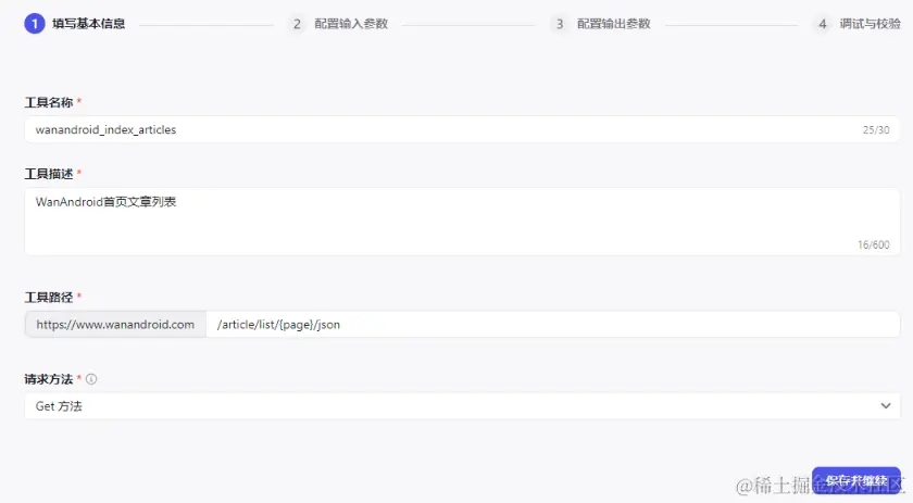 配置完点击 确认 页面跳转,点击 创建工具,填写工具的 基本信息 (这里以WanAndroid API为例):