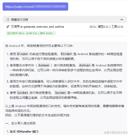 🥳 Nice!输出结果勉强达到我们的预期,内容概述和详细大纲都能同时提取出来了。当然,输出格式还要进行微调,工作流也需要再优化下,不过这些都是后话了。😳接着提一嘴 记忆库 和 插件,虽然我们暂时没用到,不过感觉还是蛮常用的,只做下简单了解,感兴趣的读者可查询对应文档。