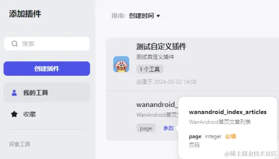 调试通过,点击 完成,会跳转到 插件详情页,点击右上角 发布,发布完,回到Bot编排那里,就可以搜到新建的插件啦: