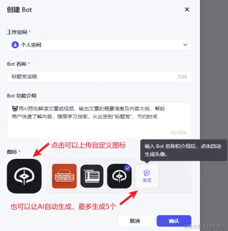 登录成功后,点击左侧 创建Bot,在弹出的窗口中依次完善 工作空间(默认就行) 、Bot名称、Bot功能介绍 和 Bot图标: