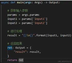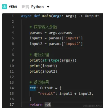 😆巧了,笔者🐍玩得还可以,不难看出代码是在一个异步main函数里执行的,入参数Args,返回值是Output: