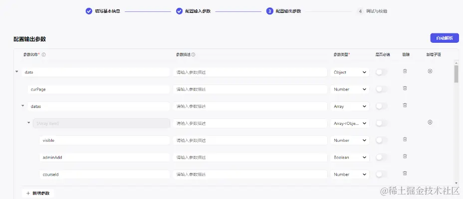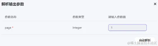 再接着 配置输出参数,可以点击右上角的 自动解析,填写输入参数调用API: