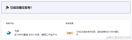 授权完,会自动回到发布的那个页面,勾选 飞书 选项,然后点击 发布,然后等 飞书审核~