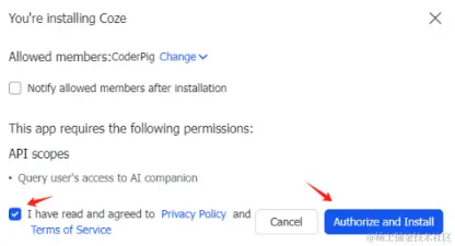 跳转后,找到Coze,点击Get,勾选同意协议,然后点击 Authorize and Install:
