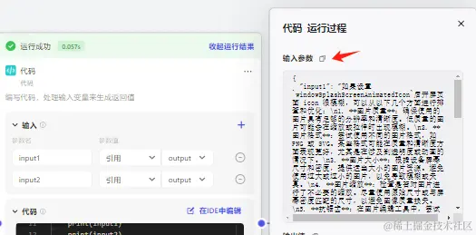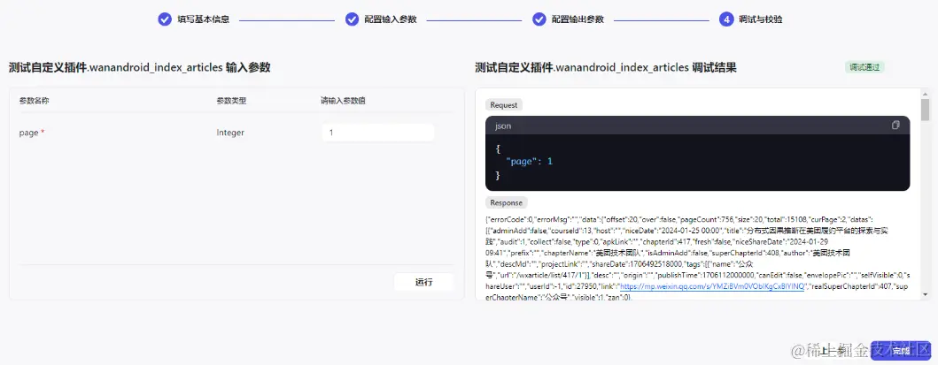 当然,也可以 手动设置输出参数,最后来到 调试与校验,填写 输入参数,点击 运行:
