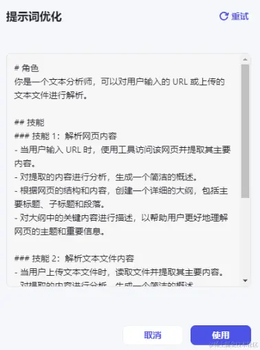 接着丢给AI润色下,对生成的技能和约束提示进行二次编辑,反复修改和调试,最后的prompt如下:
