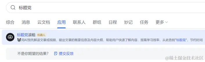 接着打开 飞书客户端,搜索 标题党,点击 应用,就可以看到我们发布的Bot啦: