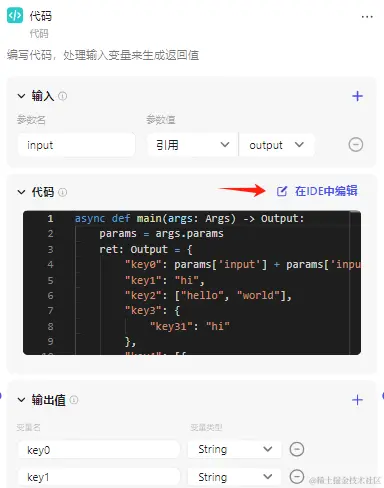 - 代码:通过IDE编写代码输入参数,并返回输出值。