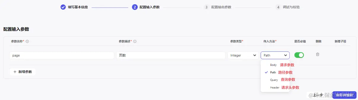 接着 配置输入参数,这里添加一个 page 参数代表当前的第几页: