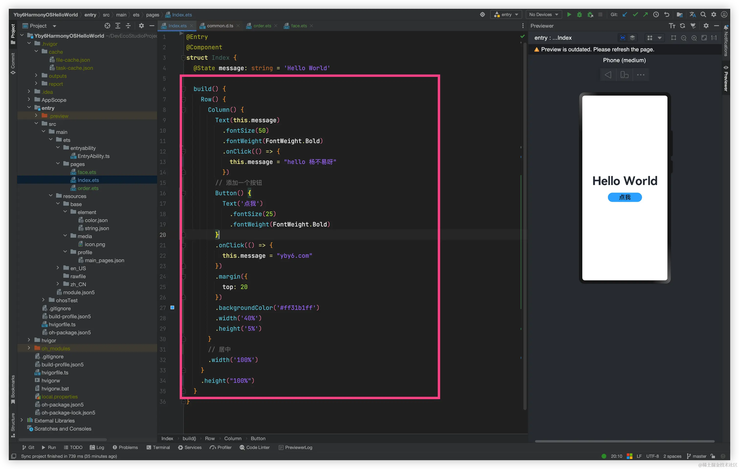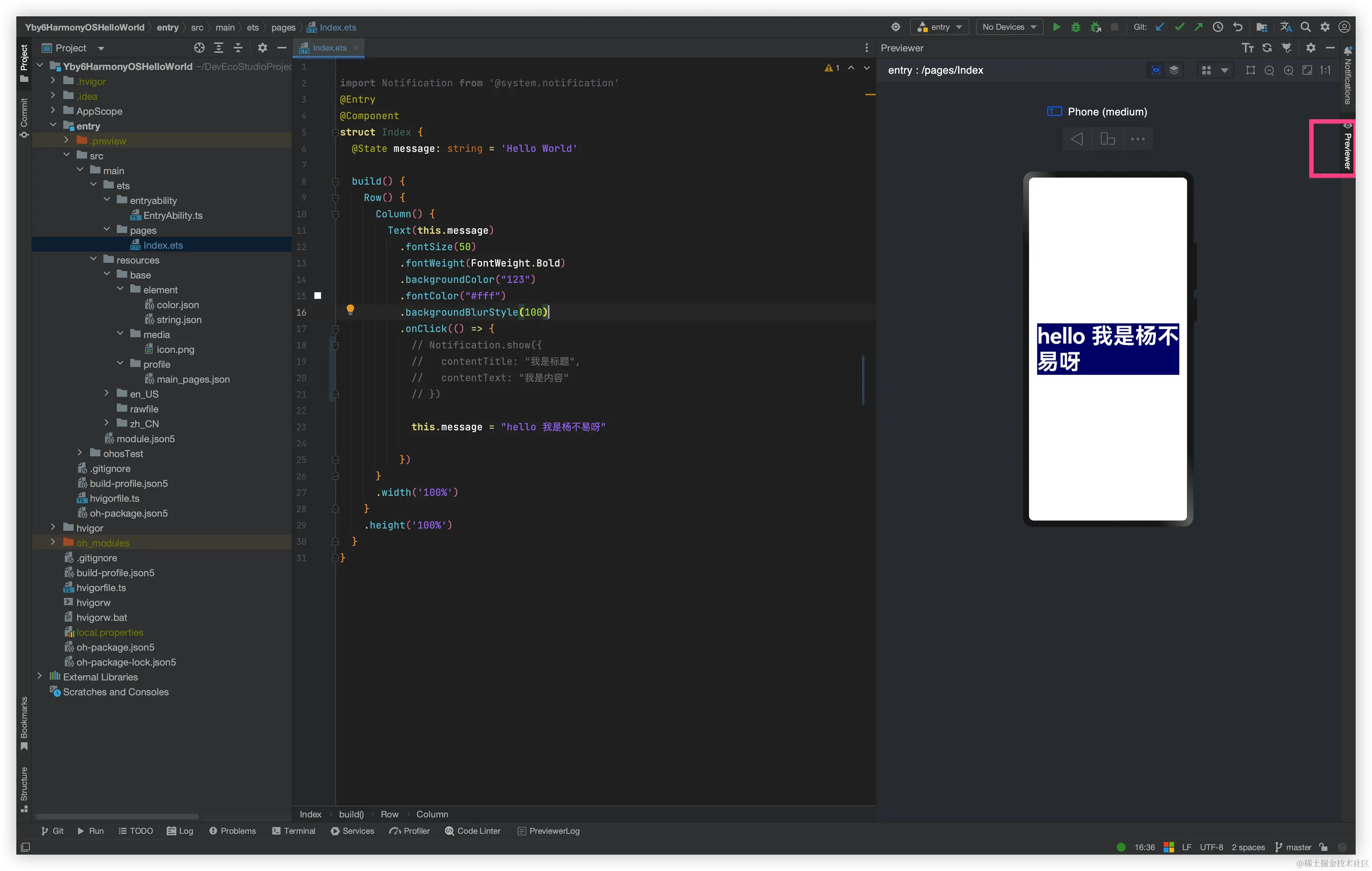 给 Index.ets 添加一个按钮 来修改 message 变量当中的参数