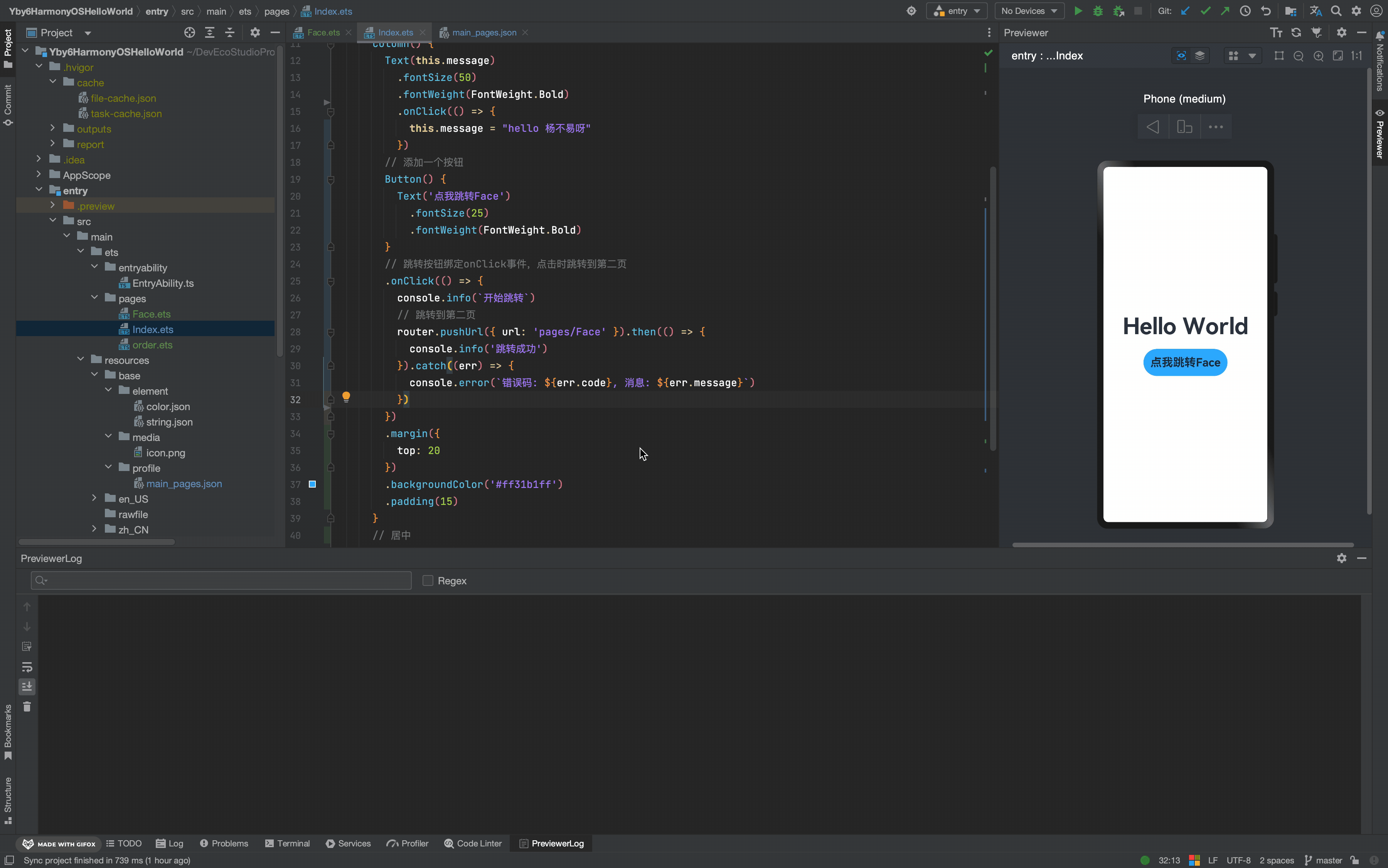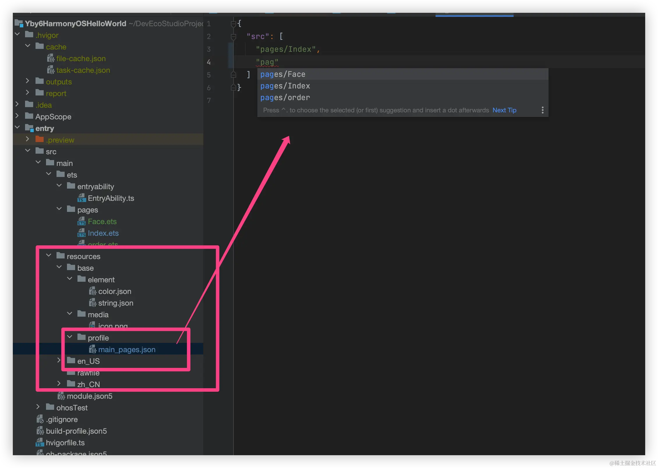 配置第二个页面的路由。在“Project”窗口,打开“entry > src > main > resources > base > profile”,在main_pages.json文件中的“src”下配置第二个页面的路由“pages/Face”