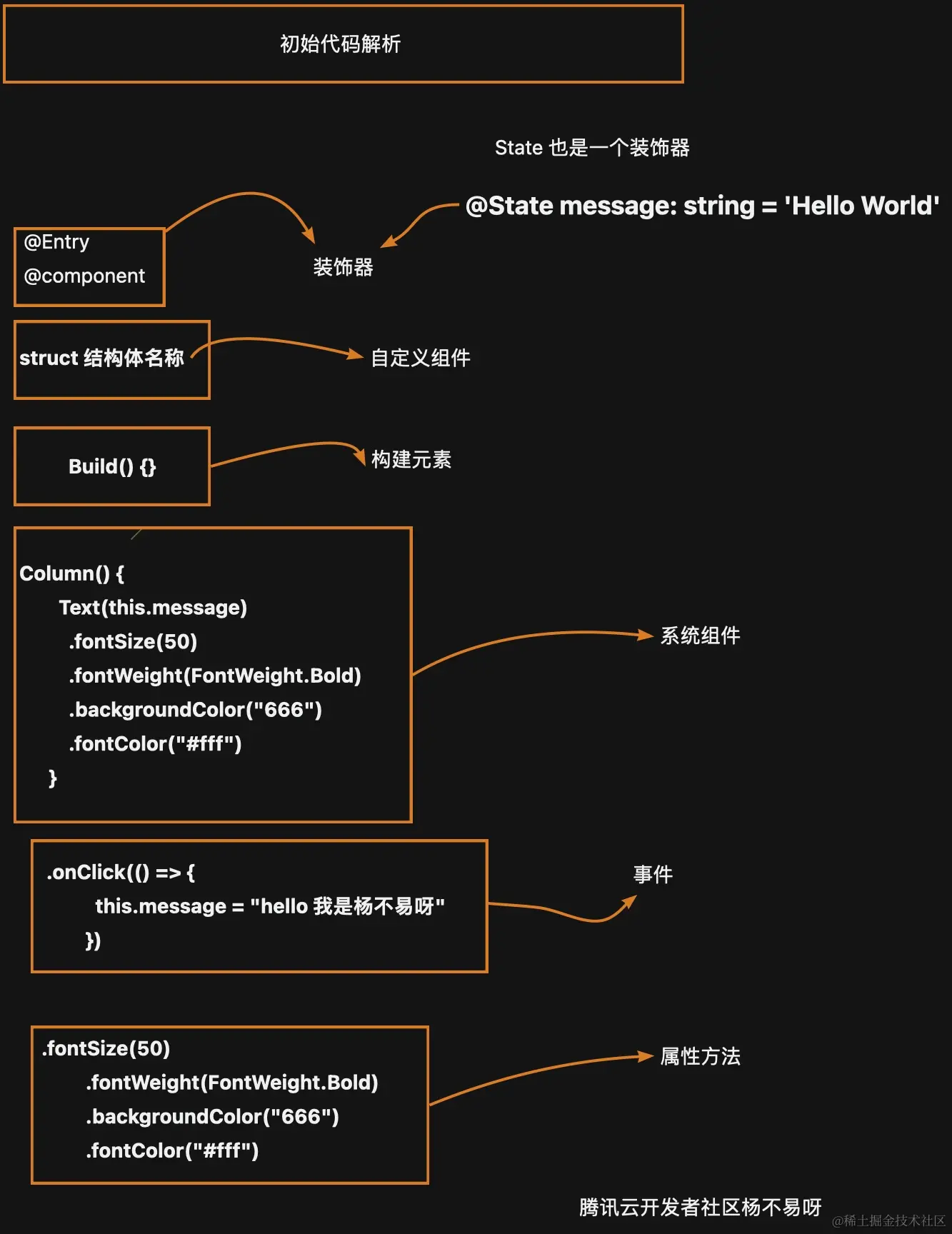 - 装饰器: 用于装饰类、结构、方法以及变量,并赋予其特殊的含义。如上述示例中@Entry、@Component和@State都是装饰器,@Component表示自定义组件,@Entry表示该自定义组件为入口组件,@State表示组件中的状态变量,状态变量变化会触发UI刷新。