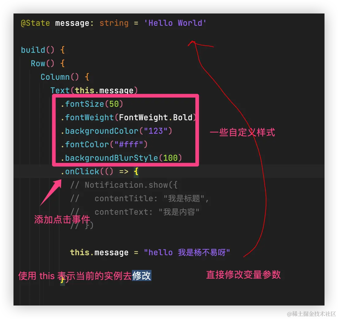 - 属性方法:组件可以通过链式调用配置多项属性,如fontSize()、width()、height()、backgroundColor()等。