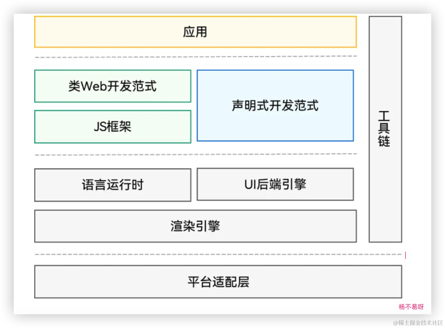 - 应用性能: 如下图所示,两种开发范式的UI后端引擎和语言运行时是共用的,但是相比类Web开发范式,声明式开发范式无需JS框架进行页面DOM管理,渲染更新链路更为精简,占用内存更少,应用性能更佳。