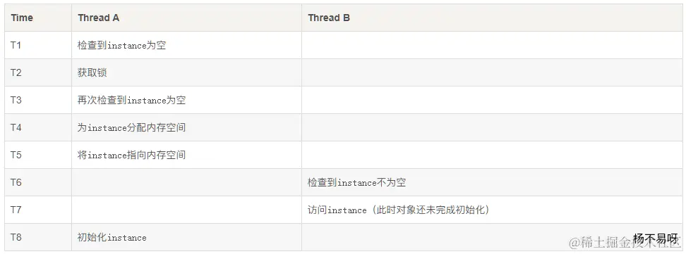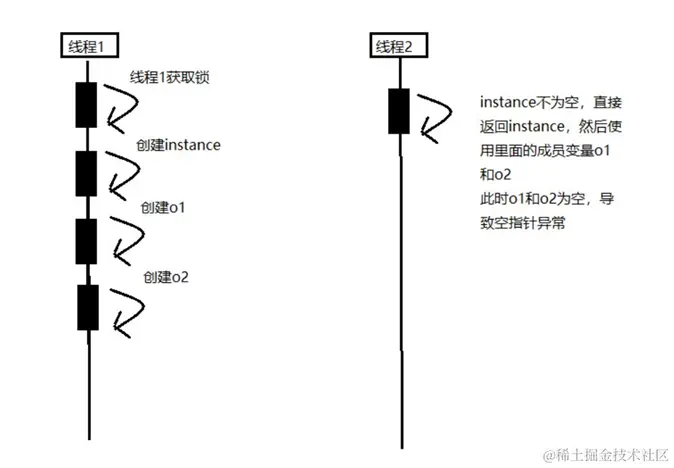 - 如果实例中存在多个成员属性. 由于在代码执行过程当中,会对代码进行重排,,重排后, 可能导致别一个线程获取对象时初始化属性不正确的情况