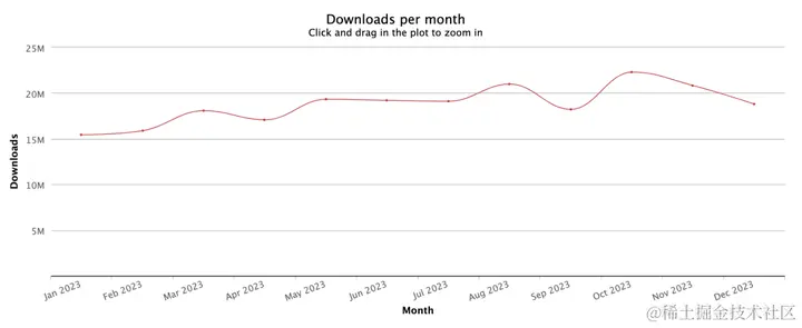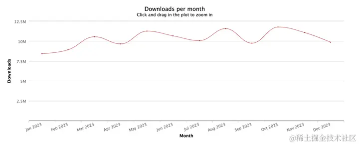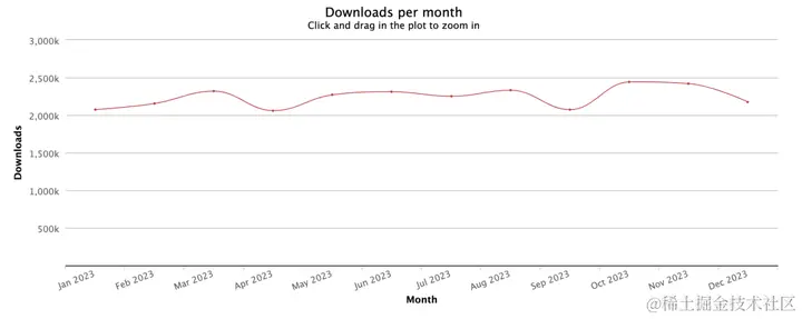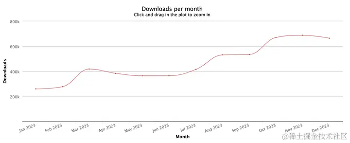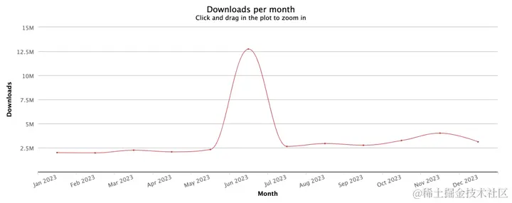 Vite 每月平均下载量 2200w 左右,2023 年累计下载量:281,709,946(2.8 亿)。