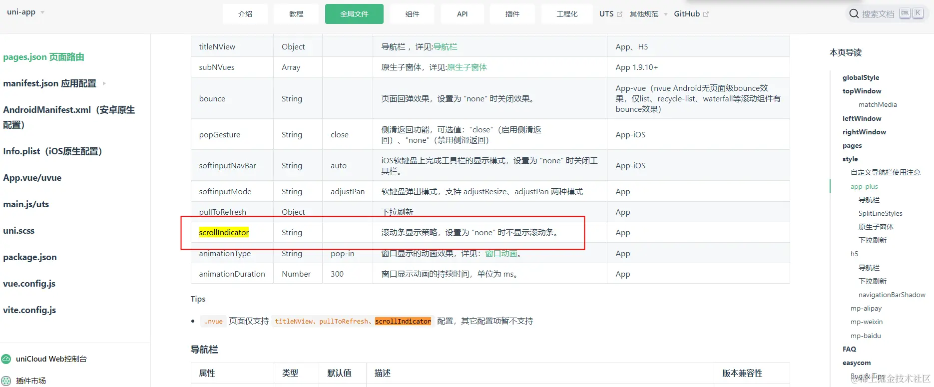 首先如果你使用的是页面级滚动,即使uni-app中的pages.json中有相关配置,在编译到小程序中也是没有效果的,因为小程序原生不支持,如下: