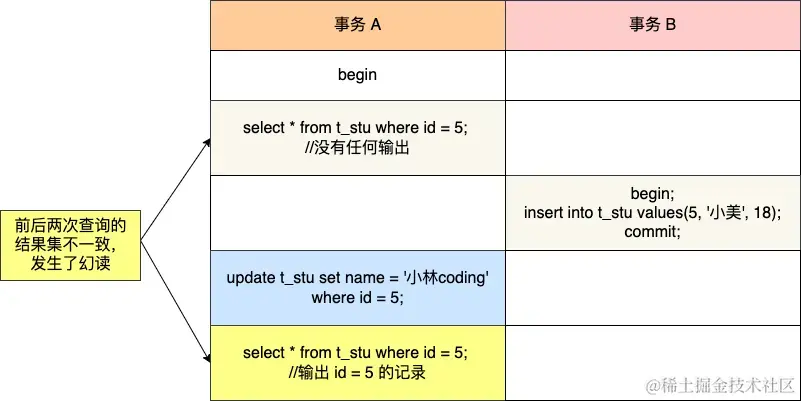 此时,事务 A 更新 id = 5 这条记录,事务 A 看不到 id = 5 这条记录,但是他去更新了这条记录,这场景确实很违和,然后再次查询 id = 5 的记录,事务 A 就能看到事务 B 插入的纪录了,幻读就是发生在这种违和的场景。
