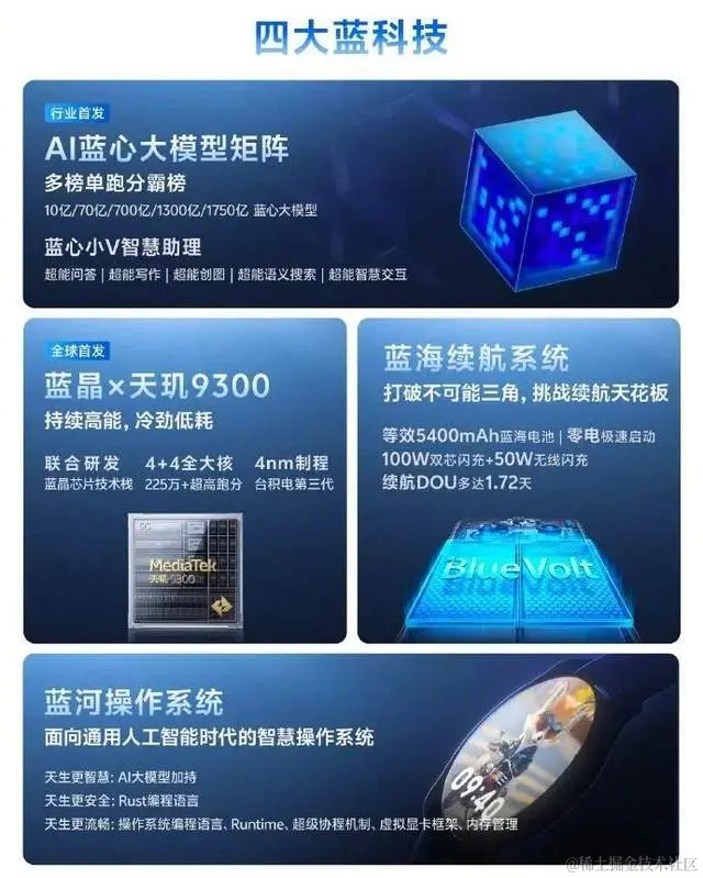 「四大蓝科技」为 vivo 在去年推出的全新技术品牌,涵盖蓝晶芯片技术栈、蓝海续航系统、蓝心大模型、蓝河操作系统等。