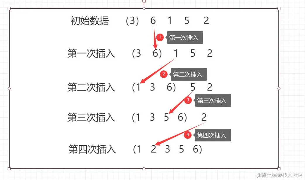 - 内部循环结束后,我们已经将当前元素key插入到正确的位置,即arr[j+1]。