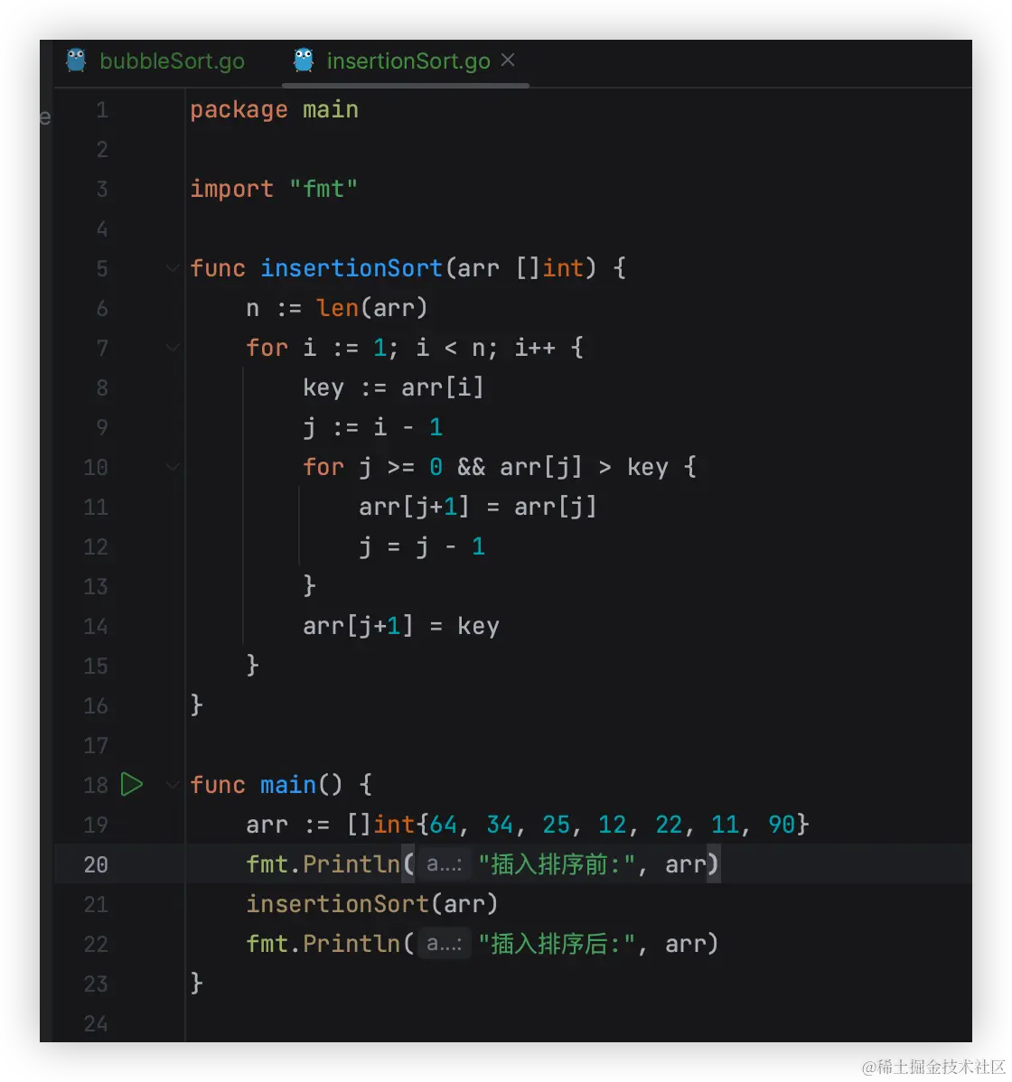 - 接下来,我们使用一个内部循环for j := i - 1; j >= 0 && arr[j] > key; j--来遍历当前元素之前的已排序部分,从当前元素的前一个元素开始,直到第一个元素。