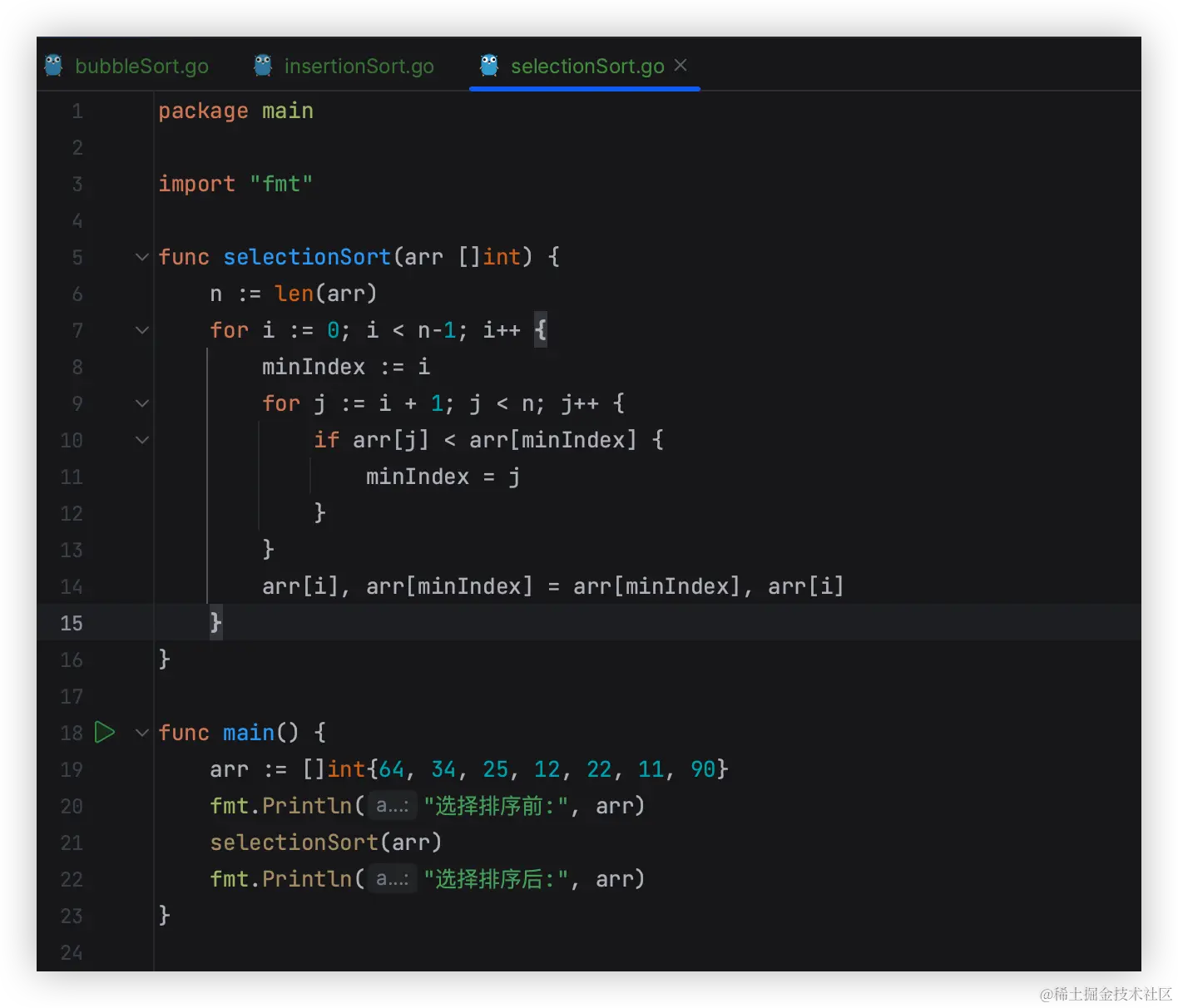 - 接下来,我们使用一个内部循环for j := i + 1; j < n; j++来遍历当前未排序部分的每个元素,从下一个元素开始,直到最后一个元素。