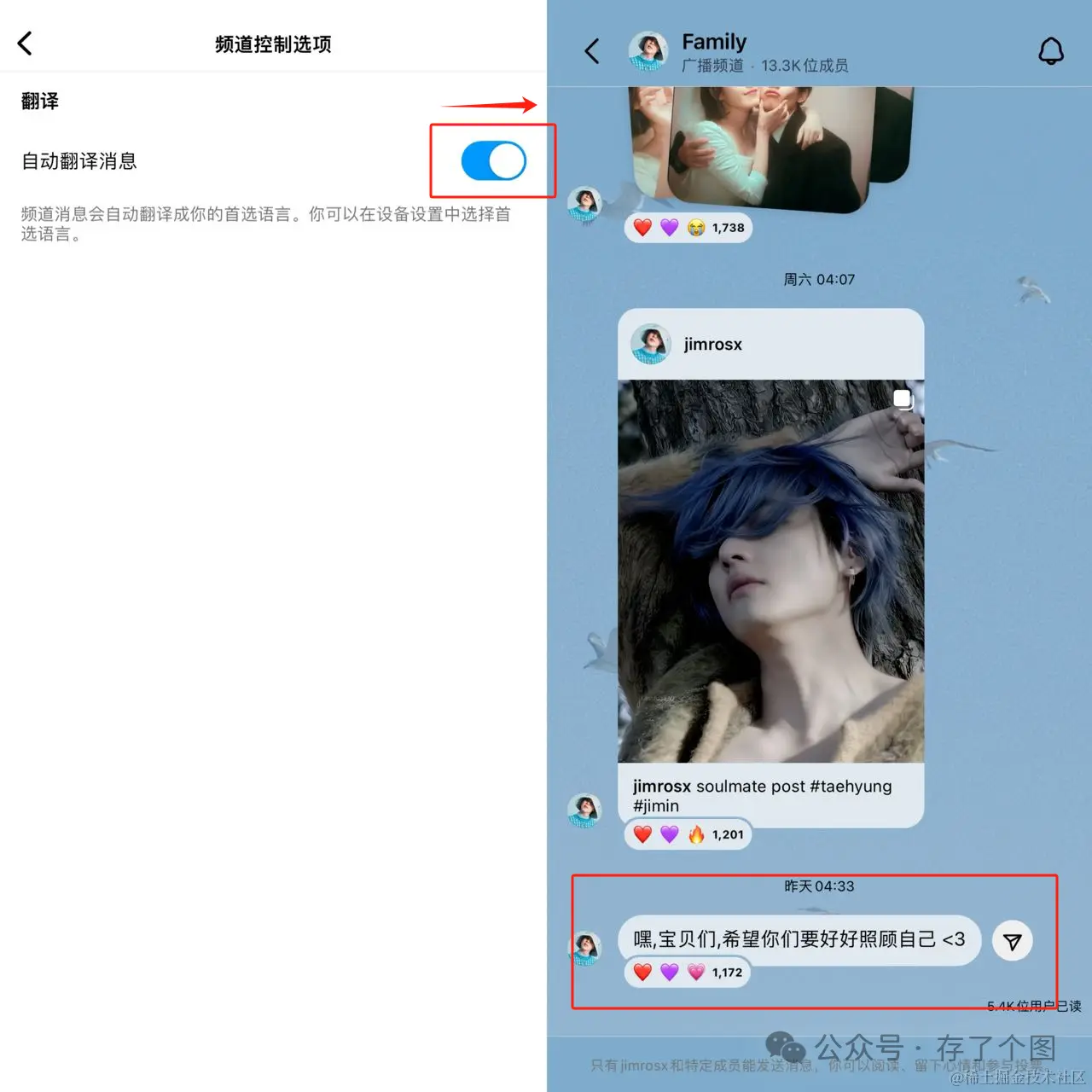 按箭头方向开启“自动翻译消息”后返回到广播专区内,该专区内的消息就会自动翻译成我们偏好的语言了!